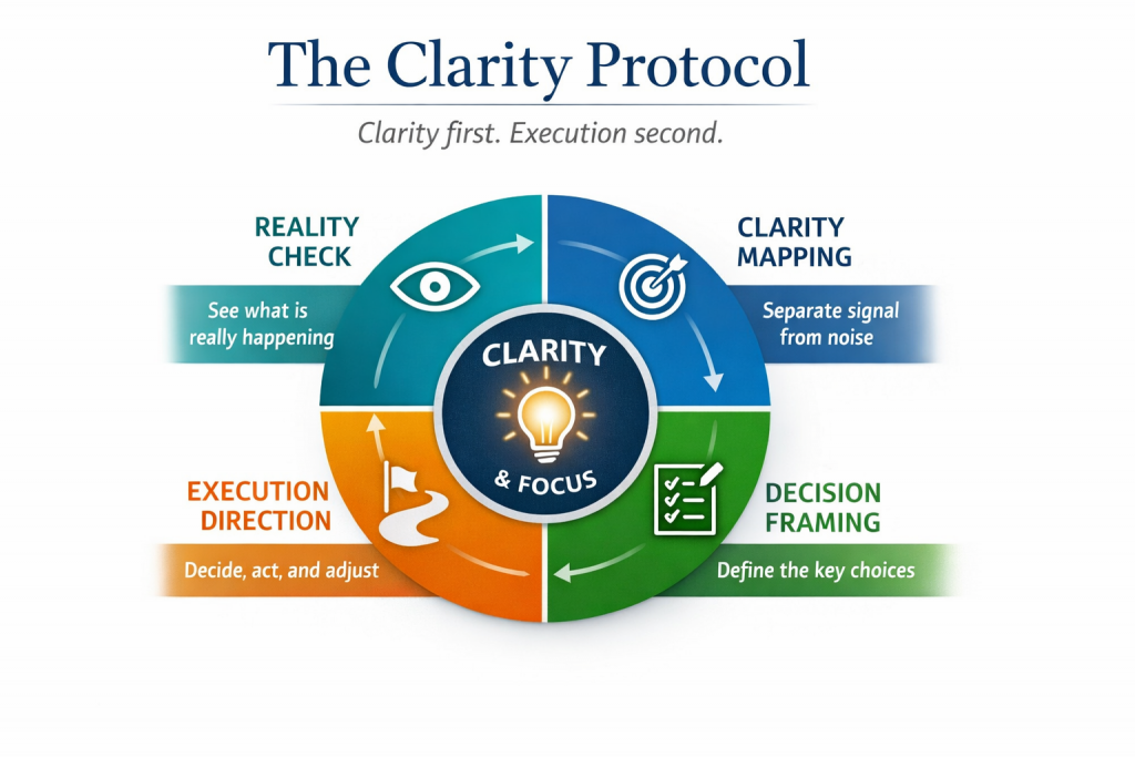 The Clarity Protocol is our structured framework for business owners who feel stuck, overloaded, or uncertain. It helps you: